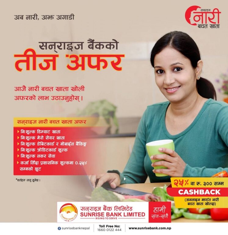 काठमाडौं, ३ भदौ । तिजको अवसरमा सनराइज बैंकले नारी विशेष योजना ल्याएको छ । भदौ महिनाभरी विभिन्न सेवाहरु निःशुल्क गर्नुका साथै क्यास ब्याक र छुटको ब्यवस्था गर्नका लागि यस योजना ल्याएको बैंकले जनाएको छ ।