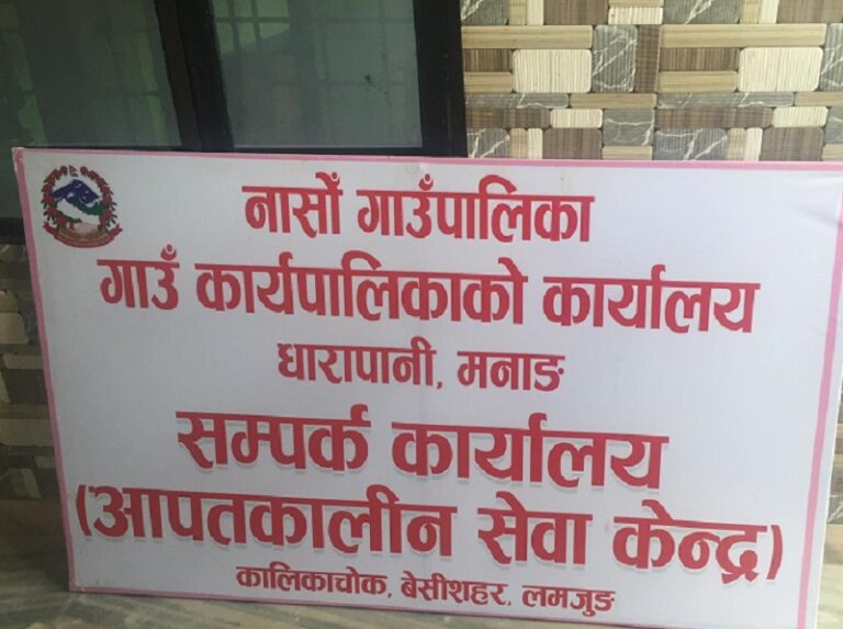 मनाङ, ९ भदौ । मनाङको नासों गाउँपालिकाले धारापानीबाट सेवा दिन थालेको छ । गत असार १ गते आएको बाढीपहिराका कारण उच्च जोखिममा परेपछि सो गाउँपालिकाको कार्यालय विस्थापित भएको थियो । त्यसपछि गाउँपालिकाले छिमेकी जिल्ला लमजुङको बँेसीशहरमा अस्थायी कार्यालय स्थापना गरेर अत्यावश्यक सेवा प्रवाह गर्दै आएको थियो ।