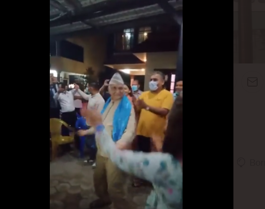 उक्त अवसरमा ओली ‘म त कति भाग्यमानी’ बोलको गीतमा नाँचिरहेको देखिन्छन् । नाँच्दै गर्दा उनले मेडिकल व्यवसायी दुर्गा प्रसाईलाई समेत हात तानेर नाच्न लगाउँछन् । भिडिओ साभार : शिव दाहालको ट्विटरबाट