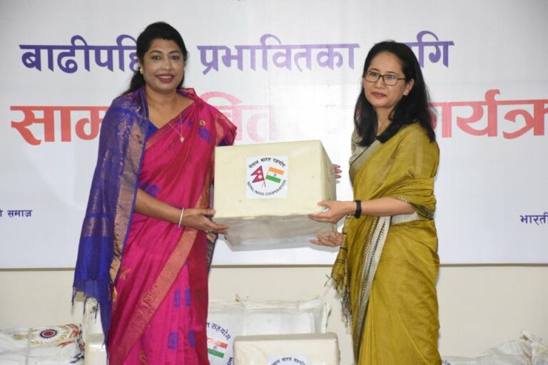 ‘बाढी र पहिरोका कारण जनजीवनमा पुगेको क्षतिलाई दृष्टिगत गर्दै स्थानीय सरकारसँगको समन्वयमा नेपाल–भारत महिला मैत्री समाज र प्राज्ञिक विद्यार्थी परिषद्मार्फत सो राहत सामाग्री चार प्रदेशका पर्सा, बारा, रौतहट, सर्लाही, धनुषा, महोत्तरी, सिराहा, सप्तरी, रुपन्देही, गोरखा, मनाङ, सिन्धुपाल्चोक, रसुवा, दोलखा र धादिङ जिल्लामा वितरण गरिनेछ ।’ दुतावासले जारी गरेको विज्ञप्तीमा उल्लेख गरिएको छ ।
