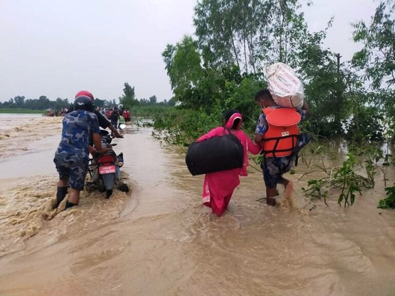 कञ्चनपुर, १२ भदौ: पुनर्वास नगरपालिका– ५ स्थित सिमरीमा दोदा नदीको बढीले डुबानमा पारेको हुलाकी राजमार्गमा स्थानीय बासिन्दालाई तार्दै गरेका सशस्त्र प्रहरी । नदीको बाढीले सडकसहितको बस्ती डुबानमा पारेपछि ६० घरपरिवारलाई सुरक्षित स्थानमा सारिएको छ ।