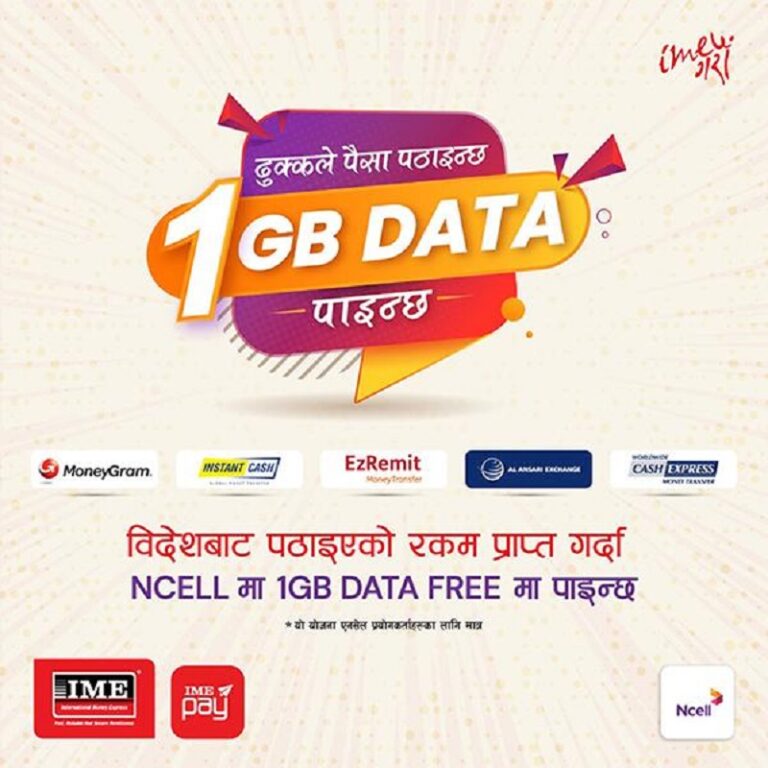 मनिग्राम, ईजेट रेमिट, इन्स्ट्यान्ट क्यार र अल अन्सार एक्सेन्ज क्यास एक्सप्रेसबाट पैसा पठाउँदा उक्त डेटा उपहार पाउने आईएमईले जनाएको छ । एनसेल र आईएमईले ‘ढुक्कले पैसा पठाइन्छ, १ जीबी डेटा पाइन्छ’ अफर ल्याएका हुन् । उक्त अफर गत १७ अगस्टदेखि नै सञ्चालन भइरहेको छ । १ जीबी डेटा ग्राहकले स्मार्टफोनमा प्रयोग गर्न सक्ने कम्पनीले जनाएको छ ।