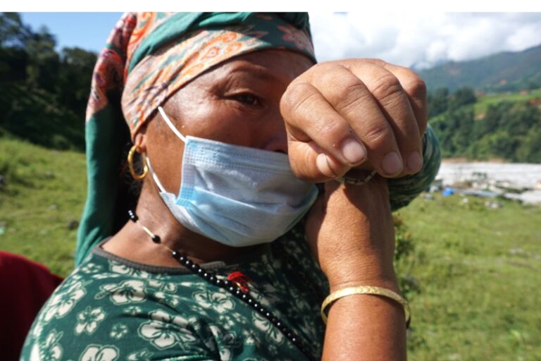 गणेशबगर (हेलम्बु), ३० भदौ । हेलम्बु डाँडाको फेदमा कच्ची सडक छेउ बस्ने ५२ वर्षीया ङाजु तामाङका आँखा हेलम्बु पहाडझैँ रसाइरहन्छन् । मेलम्ची पहाड यो बर्खा निकै रसायो । थान्किएजस्तो अझै देखिँदैन, चिस्यान बगिरहेकै छ । त्यही पहाडको रसायनले कमेरे माटोको लेदोे बोकेर बगेजस्तै ङाजुका आँखा रसाइरहन्छन् । हेलम्बु पहाडले जस्तो ङाजुका आँसुले कसैको बित्याँस पारेको भने छैन । बरु दिनदिनै आफ्नै आँत भने सुकाएको छ ।