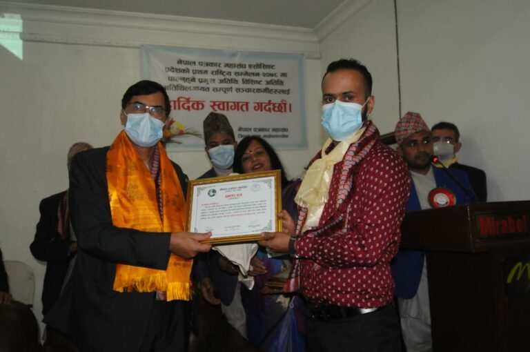 कार्यक्रमको उद्घाटन सत्रमा प्रमुख अतिथि तथा नेपाल सरकारका अर्थमन्त्री जर्नादन शर्मा, नेपाल पत्रकार महासंघ एसोसिएट प्रदेश समितिका अध्यक्ष बैकुण्ठराज पराजुली लगायतले प्रमाणपत्र सहित नगद रु १० हजारले सम्मान गरेका हुन् । कोरोना महामारी चलिरहेको समयमा महासंघ अन्तर्गत एसोसिएट प्रदेशमा आवद्ध भई विभिन्न संचारमाध्यममा संक्रिय पत्रकारमध्ये छुट्टाछुट्टै विधाका ६ जनालाई सम्मान गरिएको एसोसिएट प्रदेश समितिले जनाएको छ ।