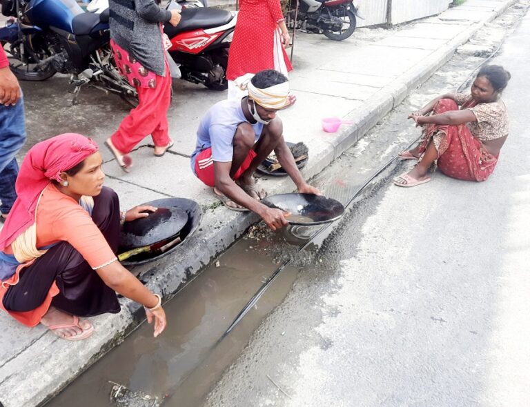 पोखरा ५, असोज: पोखरा- ८, न्युरोड सडक छेउको हिलोमा सुनका कण खोज्दै भारत महारास्ट्रका नागरिक । सुन पसल र वर्षाको पानीबाट आएको बालुवामा सुनको कण भेटिने उनीहरु बताउँछन् ।-तस्बिर:जमुना वर्षा शर्मा, रासस