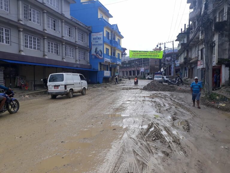 नगरपालिका र सडक संर्घष समितिले सहमति गरेपनि कामको गति भने अपेक्षा गरेअनुसार अगाडी बढन सकेन ।सडकको हालत खाल्डाखुल्डीमा परिणत छ ।कतै कतै गिट्टीहरु थुपारिएका छन् ।करिब ६९ करोडको लागतमा बन्न लागेको उक्त सडक आयोजना समयमै सम्पन्न हुन नसक्दा सडक हिलाम्मे भएर पैदल यात्रु तथा सवारी साधनलाई कष्टकर हुने गरेको छ ।