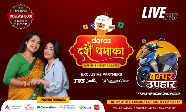काठमाडौँ, १० असोज । नेपालको अग्रणी अनलाइन बजार, दराजले आफ्नो वार्षिक उत्सव अभियान ‘दराज दशैं धमाका’ सुरु भएको घोषणा गरेको छ । यो अभियान असोज १० देखि सुरु हुने छ र यस्मा ग्राहकहरुले १० लाख भन्दा बढी उत्पादनहरुमा मज्जाको छुट पाउने कम्पनीले जनाएको छ। अभियानको मुख्य आकर्षणहरु भने निः शुल्क शिपिंग, अनलाइन प्री–पेमेन्टमा २०% (अधिकतम रु २,५००) को छुट, रु ५००० सम्मको मेगा भाउचर, ५०,००० मूल्यको उत्पादन रु १ मा जित्ने मौका र बम्पर उपहारको रूपमा टीभीएस एनटर्क १२५ स्कूटर रहेको छ। त्यसैगरी, दराजको नयाँ लाइभ स्ट्रिमि सुविधाले ग्राहकहरुलाई अभियानको अवधिमा हरेक दिन भाउचर जित्ने मौका पनि प्रदान गर्ने कम्पनिको दाबी रहेको छ।