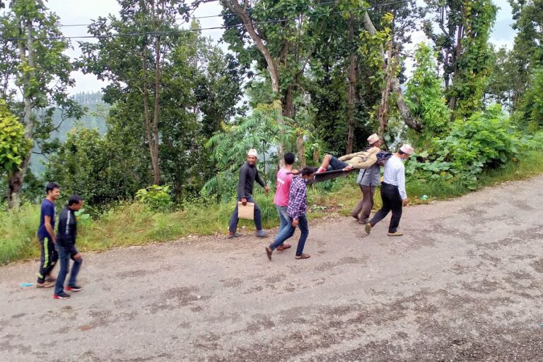 जाजरकोट , १० असोज: जिल्ला अस्पताल जाजरकोटमा उपचार हुन नसकेपछि स्टेचरमा राखेर चौरजहारीस्थित मिशन अस्पतालमा लगिँदै बिरामी । सदरमुकामस्थित रेडक्रसनजिक सडक भत्किएका कारण स्टेचरमा राखेर बिरामी बोकी लानु परेको हो ।-तस्वीर : हेमन्त केसी-रासस