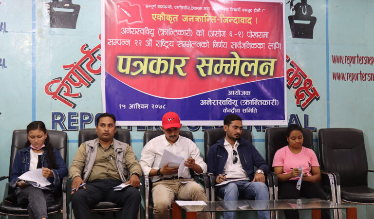 काठमाडौं, १५ असोज । नेत्रविक्रम चन्द ‘विप्लव’ नेतृत्वको नेकपानिकट अखिल नेपाल राष्ट्रिय स्वतन्त्र विद्यार्थी यूनियन (क्रान्तिकारी) ले २२औ राष्ट्रिय सम्मेलन सम्पन्न गरेको छ । नेपाल कम्युनिष्ट पार्टीका महासचिव विप्लवले उद्घाटन गरेर सुरु भएको सम्मेलन असोज ६ गतेदेखि ९ गतेसम्म पोखरामा सम्पन्न भएको आज (शुक्रबार) रिपोर्टर्स क्लब नेपालमा पत्रकार सम्मेलन गरेर जानकारी गराइएको हो ।