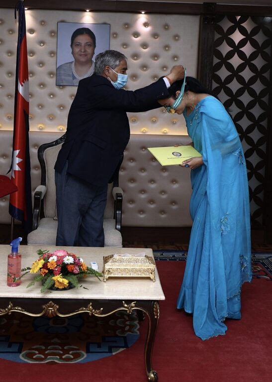 काठमाडौँ, १९ असोजः प्रधानमन्त्री शेरबहादुर देउवा मङ्गलबार बालुवाटारमा काठमाडौँ विश्वविद्यालयअन्तर्गत स्कुल अफ आर्ट्सको विकास अध्ययनको स्नातकोत्तर तहमा उत्कृष्ट नतिजा (४.०० जिपिए) ल्याई प्रथम स्थान हासिल गरेकी ऐश्वर्या रानी सिंहलाई च्यान्सलर पदक प्रदान गर्दै ।