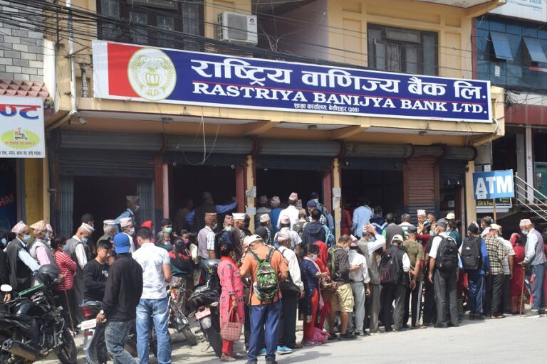 लमजुङ, १९ असोजः लमजुङको बेँसीशहर नगरपालिका वडा नं ७ मा रहेको राष्ट्रिय बाणिज्य बैंकमा मङ्गलबार पेन्सन लिनेको भीड ।-तस्बिरः जनक श्रेष्ठ-रासस