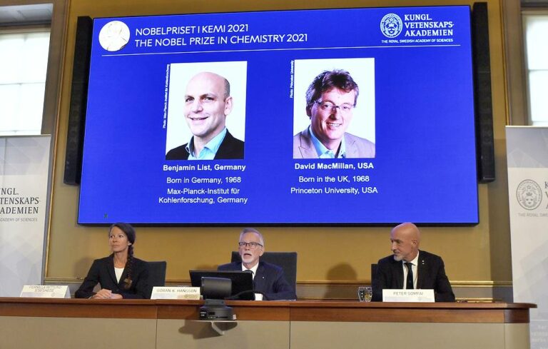 एजेन्सी, २० असोज । रसायनशास्त्रतर्फको यस वर्षको नोबेल पुरस्कार जर्मन र अमेरिकी वैज्ञानिकलाई संयुक्त रुपमा प्रदान गर्ने घोषणा भएको छ । नोबेल कमिटीले आज घोषणा गरे अनुसार जर्मन वैज्ञानिक बेन्जामिन लिष्ट र अमेरिकी वैज्ञानिक डेभिड मेकमिलनले असिमेट्रिक अर्गानोकेटलिसको विकासका लागि पुरस्कार पाउनेछन् ।