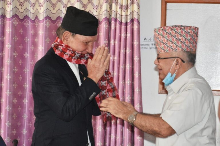काठमाडौं, २० असोज । नवनियुक्त परराष्ट्रमन्त्री डा. नारायण खड्कालाई नेकपा (एकीकृत समाजवादी) का अध्यक्ष माधव कुमार नेपालले बधाई दिएका छन् । संघीय ससंदअन्तर्गत अन्तर्राष्ट्रिय श्रम सम्बन्ध समितिको बैठकमा सहभागी हुन पुगेका मन्त्री खड्कालाई अध्यक्ष नेपालले मन्त्री भएकोमा बधाई दिनुको साथै सफलताको शुभकामना दिएका थिए । तस्विर : मुकुन्द कालिकोटे, रिपोर्टर्स नेपाल डटकम