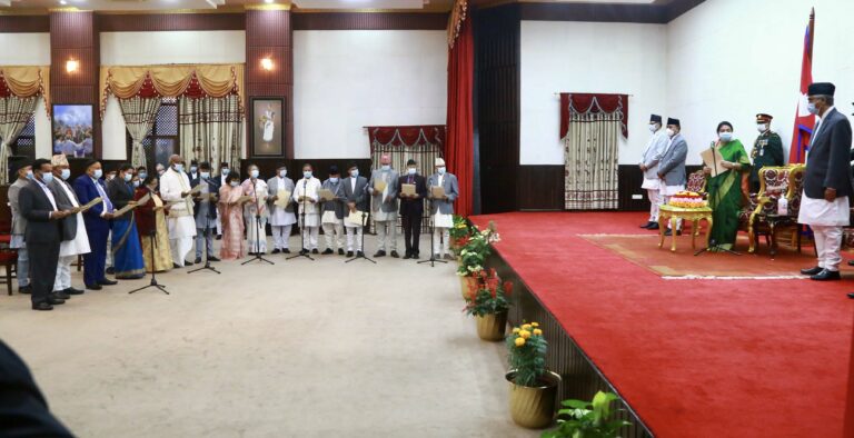 काठडमाडौं, २२ असोज । नवनियुक्त मन्त्रीहरूले सपथ लिएका छन्। आज (शुक्रबार) साँझ राष्ट्रपति कार्यालय शितलनिवासमा राष्ट्रपति विद्यादेवी भण्डारीसमक्ष नवनियुक्त मन्त्रीहरुले सपथ खाएका हुन् । त्यस्तै, राज्यमन्त्रीहरूलाई प्रधानमन्त्री शेरबहादुर देउवाले सपथ खुवाएका छन्।