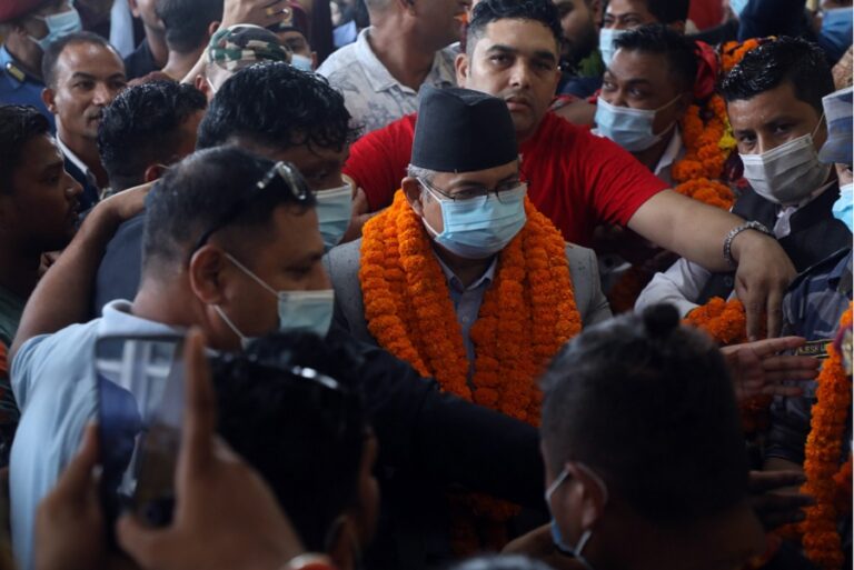 सिद्धार्थनगर, १ कात्तिकः गृहमन्त्री भएपछि पहिलो पटक गृह जिल्ला गएका मन्त्री बालकृष्ण खाँणलाई भैरहवास्थित गौतमबुद्ध विमानस्थलमा स्वागत गर्दै नेता तथा कर्ता ।-तस्बिरः नरेश केसी-रासस