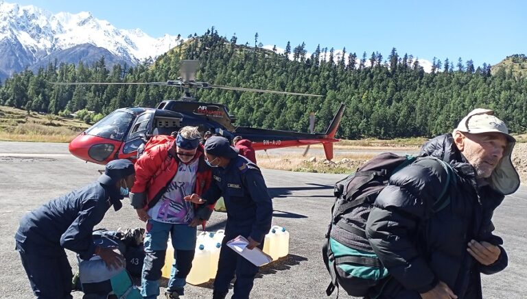 सिमकोट, ४ कात्तिक: हुम्लाको उत्तरी नाम्खा गाउँपालिकाका तुम्लिङमा अलपत्र परेका चार विदेशी र तीन नेपाली नागरिकको हेलिकोप्टरमार्फत उद्धार गरिएको छ । हिमपातले तीन दिनदेखि अलपत्र परेका उनीहरुलाई आज उद्धार गरी सिमकोट ल्याइएको हो ।
