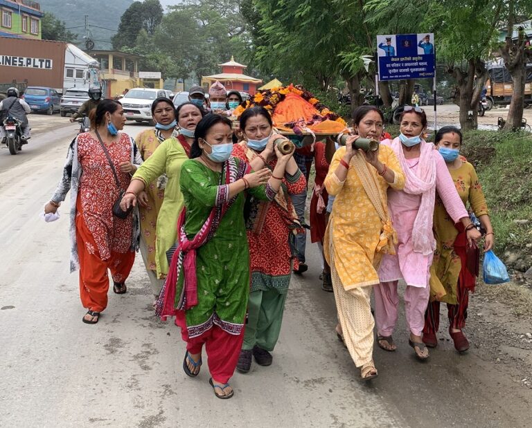 दमौली, ५ कात्तिक। तनहुँको व्यास नगरपालिका–५ स्थित ज्येष्ठ नागरिक आश्रममा आश्रय लिइरहेका जगतबहादुर अधिकारीको शुक्रबार बिहान मृत्यु भएपछि शव बोकेर घाटतर्फ जाँदै आश्रमका सञ्चालक महिलाहरु । आश्रममा मृत्यु भएका ज्येष्ठ नागरिक शव महिलाहरुले नै बोकेर घाटसम्म लैजाने गरेका छन् ।-तस्वीर : कृष्ण न्यौपाने, रासस