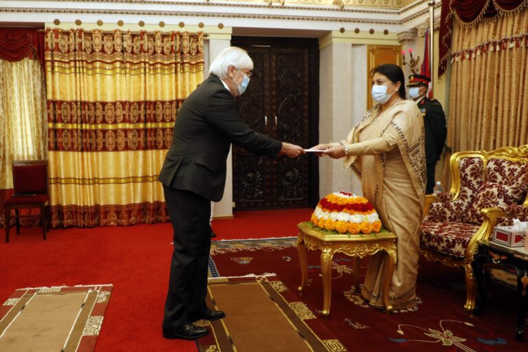 काठमाडौं, ५ कार्तिक । नेपालका लागि विभिन्न पाँच देशका आवासीय तथा गैरआवासीय राजदूतहरुले आज राष्ट्रपति विद्यादेवी भण्डारीसमक्ष ओहदाको प्रमाणपत्र पेश गरेका छन् । राजदूतहरूले आज राष्ट्रपति भवनमा आयोजित छुट्टाछुट्टै विशेष समारोहमा आ–आफ्नो ओहदाको प्रमाणपत्र पेश गरेका हुन् ।