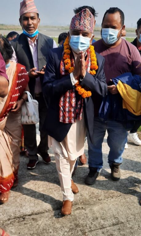 गोदावरी, ६ कात्तिक: सुदूरपश्चिम प्रदेशको बाढी प्रभावित क्षेत्र अवलोकनका लागि शनिबार गएका नेपाली कांग्रेसका बरिष्ठ नेता रामचन्द्र पौडेललाई धनगढी विमानस्थलमा स्वागत गर्दै कांग्रेस कार्यकर्ता ।-तस्बिर : मीन ठकुरी, रासस