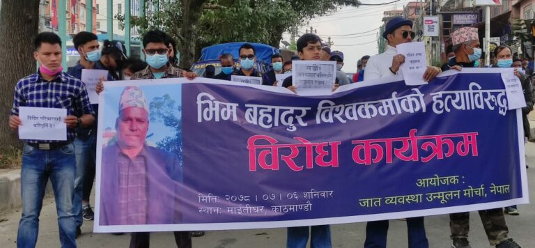 काठमाडौं, ६ कार्तिक । भीम बहादुर विश्वकर्माको हत्याविरुद्ध आज काठमाडौंको माईतीघरमा प्रदर्शन गरिएको छ । जात व्यवस्था उन्मुलन मोर्चा, नेपालको आयोजनामा प्रदर्शन गरिएको हो । उनीहरुले पीडित परिवारलाई क्षतिपूर्ति दिनसमेत गरेका छन् ।