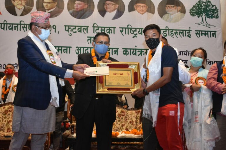 माल्दिभ्समा आयोजना भएको साफ च्याम्पियनसिप फुटबलमा उपविजेता बनेको नेपाली राष्ट्रिय फुटबल टोली नगदसहित सम्मान गरेको हो ।