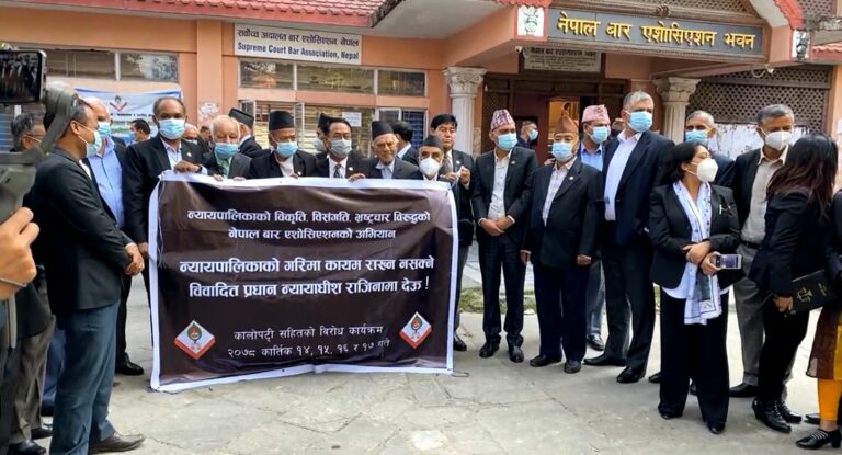 बारको पदाधिकारीसहित कानुन व्यवसायीहरु कालो पट्टी बाँधेर सर्वोच्च अदालतमा देखिएका थिए । उनीहरुले प्रधानन्यायाधीश जबराको राजीनामा माग्दै आएका छन् ।