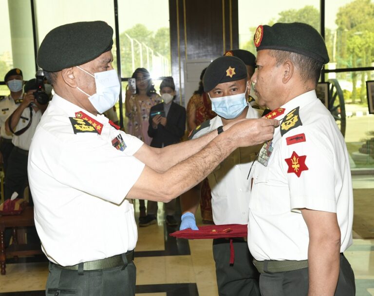 काठमाडौँ, १४ कात्तिक: प्रधानसेनापति प्रभुराम शर्माले रथीमा पदोन्नति भएका सरोजप्रताप राणालाई दज्र्यानी चिह्न प्रदान घरेका छन् । सैनिक मुख्यालय जङ्गी अड्डामा आज आयोजित समारोहमा महारथी शर्माले रथी राणालाई दज्र्यानी चिह्न लगाई दिएका हुन् ।