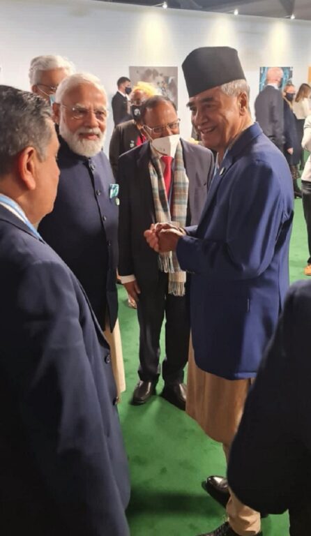 जलवायु परिवर्तनसम्बन्धी २६औँ अन्तर्राष्ट्रिय सम्मेलन (कोप–२६)मा सहभागी विश्व नेताहरुको शिखर बैठकको क्रममा ग्लास्गोमा सोमबार देउवा र मोदीबीच भेटवार्ता भएको हो । भेटवार्तामा आफूहरुबीच हिमालय क्षेत्रको दिगो विकास र सहकार्यबारे कुराकानी भएको प्रधानमन्त्री देउवाले ट्विटमा उल्लेख गरेका छन् ।