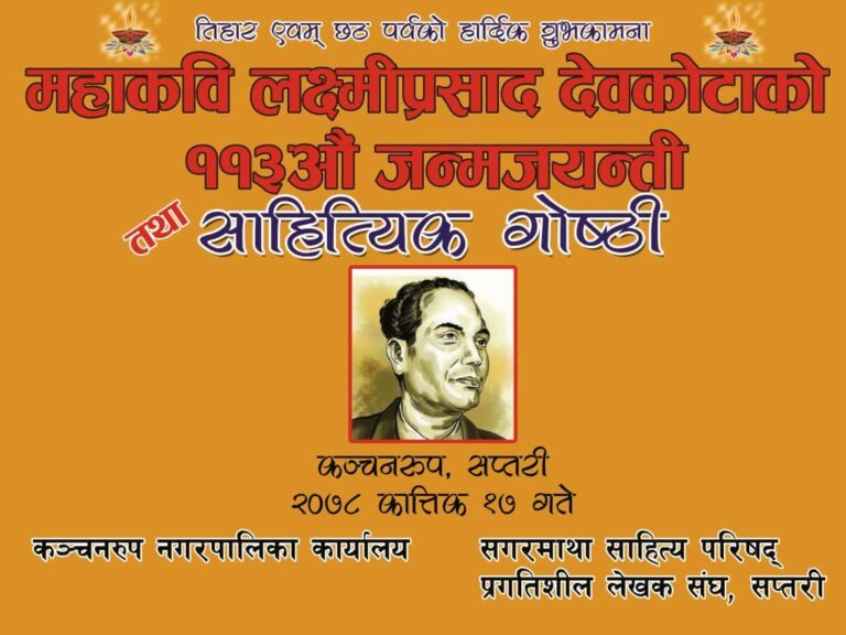 सप्तरी, १६ कात्तिक । महाकवि लक्ष्मीप्रसाद देवकोटाको ११३औँ जन्मजयन्ती भोलि (बुधबार) विभिन्न कार्यक्रम गरी सप्तरीको कञ्चनरुपमा मनाइँदैछ । सगरमाथा साहित्य परिषद् र प्रगतिशील लेखक संघको आयोजना तथा कञ्चनरुप नगरपालिकाको सहयोगमा साहित्यिक गोष्ठी एवम् शुभकामना आदानप्रदान हुने प्रलेस सप्तरीका उपाध्यक्ष मेघराज पौडेलले जानकारी दिए ।