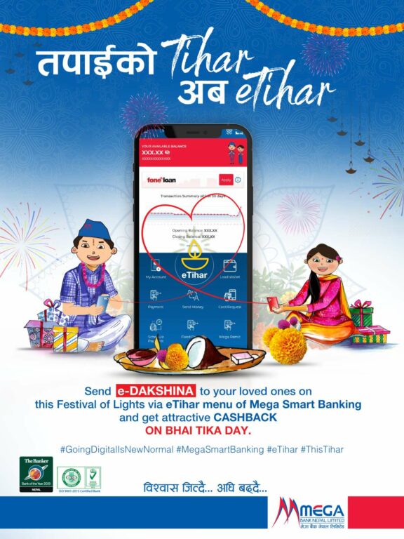 डिजिटल कारोबारलाई प्रोत्साहन गर्ने उद्देश्यले मेगा बैंकले तिहारमा उपहार स्वरुप “इ–तिहार क्याम्पियन” र “मेगा मार्ट क्याम्पियन” ल्याएको हो ।