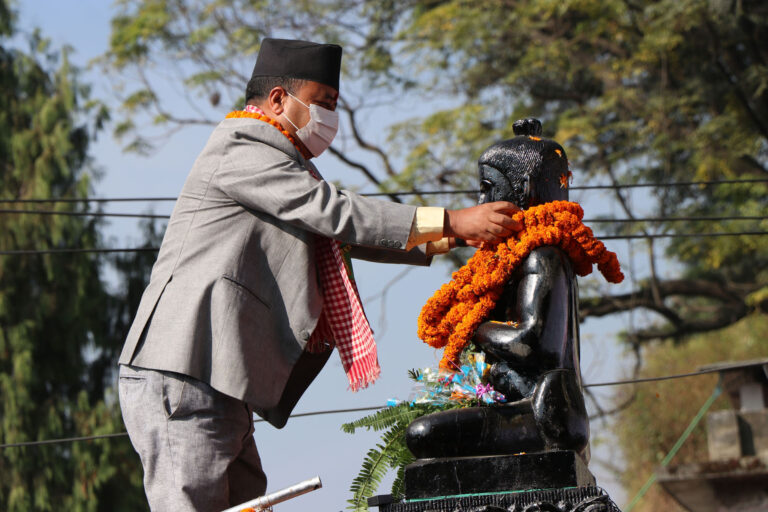 भक्तपुर, १९ कार्तिक । प्रतिनिधि सभाका सांसद महेश बस्नेत शुक्रबार राष्ट्रिय विभूति शंखधर साख्वाः प्रतिष्ठानले आयोजना गरेको कार्यक्रममा मध्यपुरथिमि शंखधर चोकमा रहेको राष्ट्रिय विभूति शंखधर साख्वाःको शालिकमा माल्यार्पण गर्दै । तस्विर : रासस