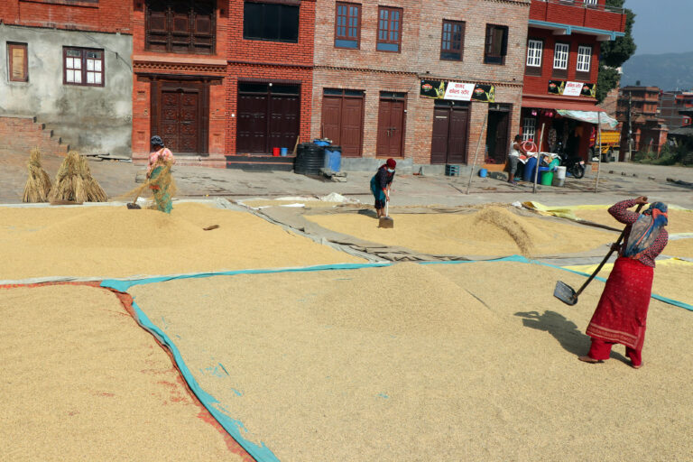 भक्तपुर, २३ कात्तिक । भक्तपुर नगरपालिकाको ल्यासिंखेलस्थित खुला ठाउँमा धान सुकाउँदै स्थानीयवासी । तस्बिरः रमेश गिरी÷रासस