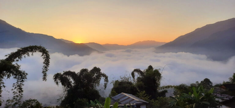 बाग्लुङ बजारलाई ढाकेको कुहिरो र सूर्योदय