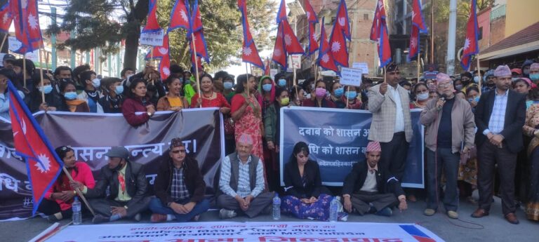 काठमाडौं, २५ कार्तिक । दबाबको शासन अन्त्य गर्नुपर्ने र विधिको शासन कायम गरिनुपर्ने भन्दै नागरिकहरु प्रदर्शनमा उत्रिएका छन् । आज (बिहीबार) काठमाडौंको माईतीघरमा प्रदर्शनमा उत्रिएकाहरुले यस्तो नारा लेखिएको ब्यानर बोकेका छन् ।