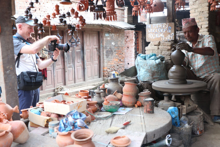 भक्तपुर, २५ कात्तिक । भक्तपुरको पोटरी स्क्वायरमा माटोका भाँडा बनाउँदै गरेको तस्बिर लिँदै विदेशी पर्यटक । कोरोना भाइरसको महामारी कम हुँदै गएपछि भक्तपुरमा विदेशी पर्यटकको आगमन बढ्न थालेको छ । तस्बिरः रमेश गिरी÷रासस
