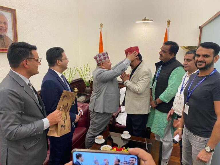 काठमाडौं, २७ कार्तिक । भारत भ्रमणमा रहेको संस्कृति, पर्यटन तथा नागरिक उड्ययनमन्त्री प्रमे आलेले भारतीय पर्यटन राज्यमन्त्री अजय भट्टसँग भेटवार्ता गरेका छन् । भेटको क्रममा मन्त्री आलेले भट्टलाई ढाका टोपी लगाईदिएका थिए ।