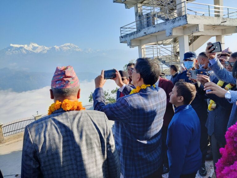 पोखरा, २७ कात्तिक: अर्थमन्त्री जनार्दन शर्मा पोखरा महानगरपालिका–२२ पुम्दीकोटमा निर्माण हुँदै गरेको विशाल महादेवको मूर्ति अवलोकनको क्रममा आफ्नो मोबाइलमा हिमालको दृष्य कैद गर्दै ।-तस्वीर : राधिका कँडेल-रासस