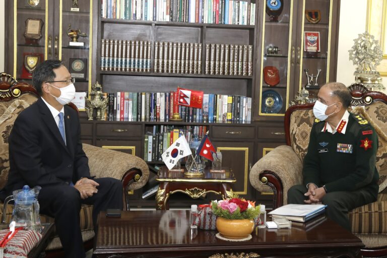 काठमाडौं, ३० कात्तिक । प्रधान सेनापति महारथी प्रभुराम शर्मा र कोरियाका राजदूत Mr. Park Chong-Suk बीच आज भेटघाट भएको छ । शर्मा र Suk को मंगलबार जङ्गी अड्डामा शिष्टाचार भेट भएको हो ।