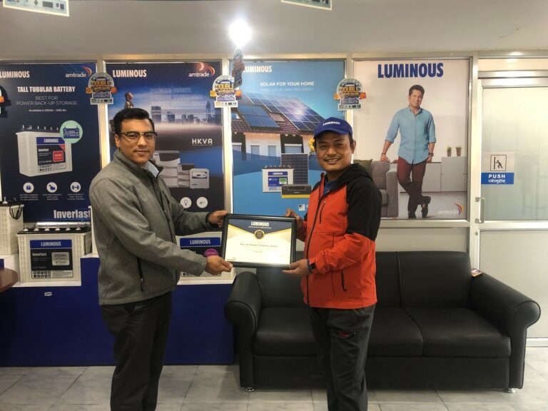 काठमाडौं, ३ मंसिर । लुमिनास पावर ब्याकअप सोलुसन र सनवर्थ सोलार प्यानलको लागि आधिकारिक बिक्रेता अमट्रेड प्रालीले श्री जल विनायक इन्टरप्राइजेज ललितपुरलाई अक्टोबर महिनाको ‘डिलर अफ द मन्थ’ सम्मान प्रदान गरेको छ ।