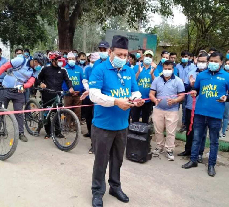 कैलाली, ४ मंसिर । स्वास्थ्य कार्यालय कैलालीको आयोजनामा सञ्चालन गरिएको ‘म हिडछु मेरो प्रदेश हिडछ’ कार्यक्रमको आज बिहान उद्घाटन गर्दै सुदूरपश्चिम प्रदेशका सामाजिक विकास मन्त्री लाल बहादुर खड्का । तस्वीरः सुदूरपश्चिम प्रदेश सामाजिक विकास मन्त्रालय÷रासस