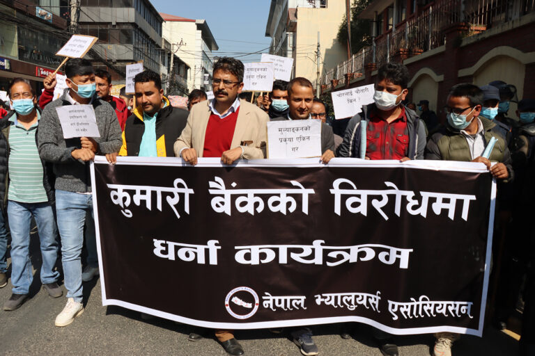 काठमाडौं, ५ मंसिर । कुमारी बैंकविरूद्ध आज नेपाल भ्यालुयर्स एसोसिएसनले विरोध प्रदर्शन गरेको छ । बैंकले गलत नियतले मूल्याङ्कनकर्ता इन्जिनियरलाई जेल हालेको विषयमा मूल्याङ्कन कार्यमा संलग्न व्यक्तिहरूको उपस्थितिमा विरोध कार्यक्रम सम्पन्न भएको हो ।