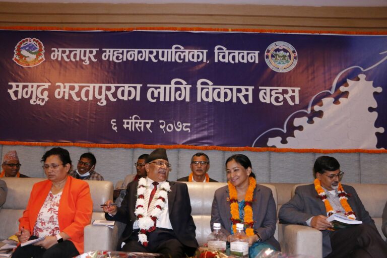 प्रचण्डले भरतपुर महानगरपालिका एक नम्बरको मेयर भएको बताए । उनले भने,‘सबै भरतपुरबाट सिक्नुपर्छ भन्न थालेका छन् । सबै सबै तिर भरतपुरको जस्तो विकास हुनुपर्छ भन्ने भएको छ ।’
