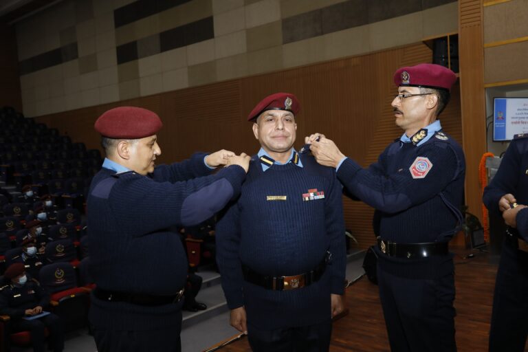 काठमाडौं, ९ मंसिर । निमित्त प्रहरी महानिरीक्षक प्रहरी अतिरिक्त महानिरीक्षक निरज बहादुर शाहीले प्रहरी वरिष्ठ उपरीक्षक पदमा पदोन्नति भएका ८ जना वरिष्ठ प्रहरी अधिकृतहरूलाई बुधबार प्रहरी प्रधान कार्यालयमा आयोजित कार्यक्रमबीच दर्ज्यानी चिन्हद्वारा सुशोभन गरेका छन् ।