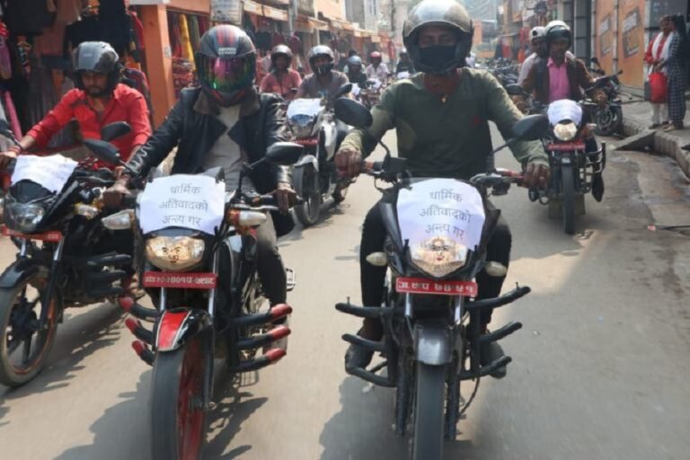 काठमाडौं, ९ मंसिर । जनकपुरधाममा आतंकवादविरुद्ध युवाहरुले आज मोटरसाइकल र्याली प्रदर्शन गरेका छन् । राष्ट्रिय एकता अभियानको अगुवाईमा युवाहरुले आतंकबादविरुद्ध मोटरसाइकल र्याली प्रदर्शन गरेका हुन् । भारतको मुम्बईमा भएको आतंकवादी हमलाको विरुद्धमा युवाहरुले मोटरसाइकल र्याली गरेका हुन् ।