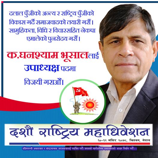 चितवन, ११ मङ्सिर। नेकपा (एमाले)का नेता घनश्याम भुसालले उपाध्यक्ष पदमा उम्मेदवारी घोषणा गरेका छन् । सामाजिक सञ्जाल फेसबुकमार्फत् उनले उम्मेदवारी घोषणा गरेका हुन् । बन्दशत्र शुरू हुनै लाग्दा घनश्याम भुसालले उपाध्यक्षमा गरे उम्मेदवारी घोषणा गरेका हुन्।