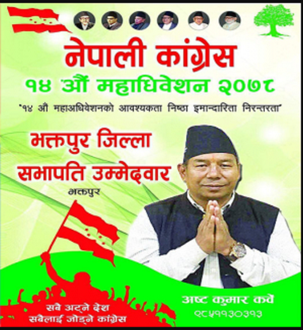 भक्तपुर, १२ मङ्सिर: नेपाली कांग्रेस भक्तपुर जिल्ला कार्यसमिति सभापति पदमा अष्टकुमार कवेँले उम्मेदवारी दिएका छन् । कांग्रेसका पूर्व जिल्ला सभापतिद्वय महेश श्रेष्ठ र गणेशमान चक्रधरका उपस्थितिमा शनिबार आयोजित कार्यक्रममा उनले जिल्ला सभापति पदमा उम्मेदवारी घोषणा गरेका हुन् ।