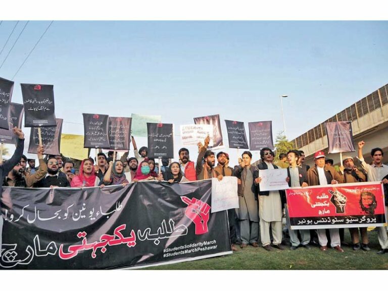 पेशावर [पाकिस्तान], १२ मङ्सिर: पेशावर शहरका विद्यार्थीहरूले विद्यार्थी युनियनहरूमाथि प्रतिबन्ध लगाइएकोमा इमरान खानको सरकारको विरोधमा शुक्रबार विरोध र्याली गरेका छन्। विद्यार्थीलाई सुविधा उपलब्ध गराउनुपर्ने माग लेखिएका प्लेकार्ड तथा ब्यानर बोकेका विद्यार्थीले प्रदर्शनमा भाग लिएका थिए । प्रदर्शनकारीहरूले विद्यार्थी युनियनहरूको पुनर्स्थापनाको माग गरेका छन् ।