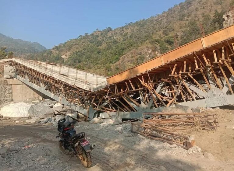भोजपुर, १२ मङसिरः भोजपुरको रामप्रसादराई गाउँपालिका र हतुवागढी गाउँपालिकालाई जोड्ने कावा खोलामाथि निर्माण भइरहेकोे अवस्थामा भाँचिएको पुल । पुल रु पाँच करोडभन्दा बढीको लागतमा निर्माण भइरहेको थियो ।-तस्बीर : युवराज विष्ट-रासस