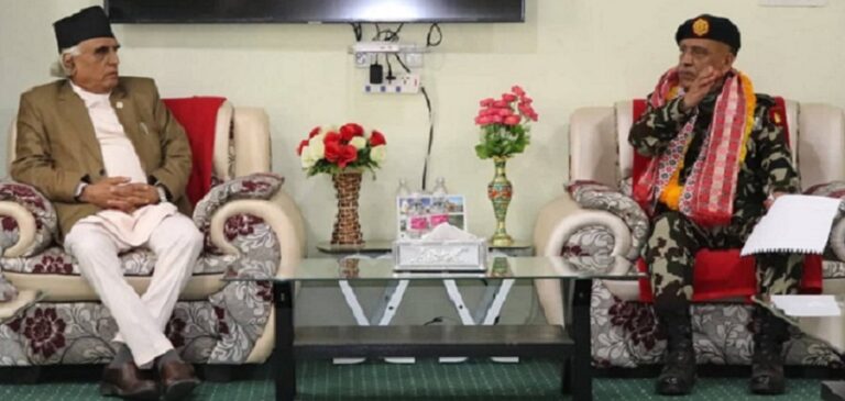गण्डकी, १३ मङ्सिर: गण्डकी प्रदेशका मुख्यमन्त्री कृष्णचन्द्र नेपाली पोखरेल र प्रधानसेनापति प्रभुराम शर्माका बीच आइतबार भेटवार्ता सम्पन्न भएको छ । मुख्यमन्त्री कार्यालयमै भएको भेटमा मुलुकको शान्ति सुरक्षा र समसामयिक विषयमा कुराकानी भएको जनाइएको छ ।