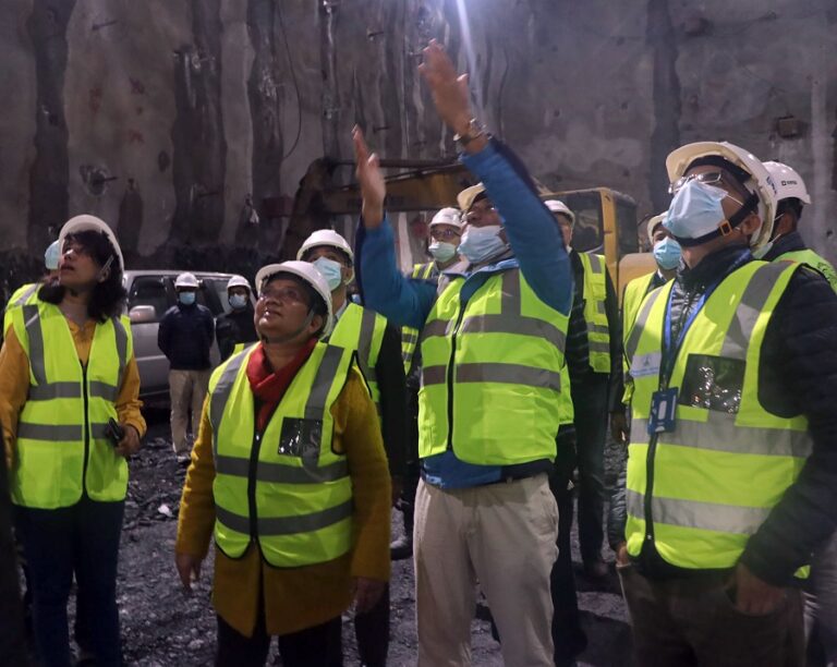 दमौली, १३ मङ्सिर: ऊर्जा, जलस्रोत तथा सिँचाइमन्त्री पम्फा भुसाल सोमबार तनहुँको ऋषिङ गाउँपालिका–१ मा निर्माणाधीन १४० मेगावाट क्षमताको बाँधस्थल निरीक्षण गर्दै ।-तस्वीर : कृष्ण न्यौपाने-रासस